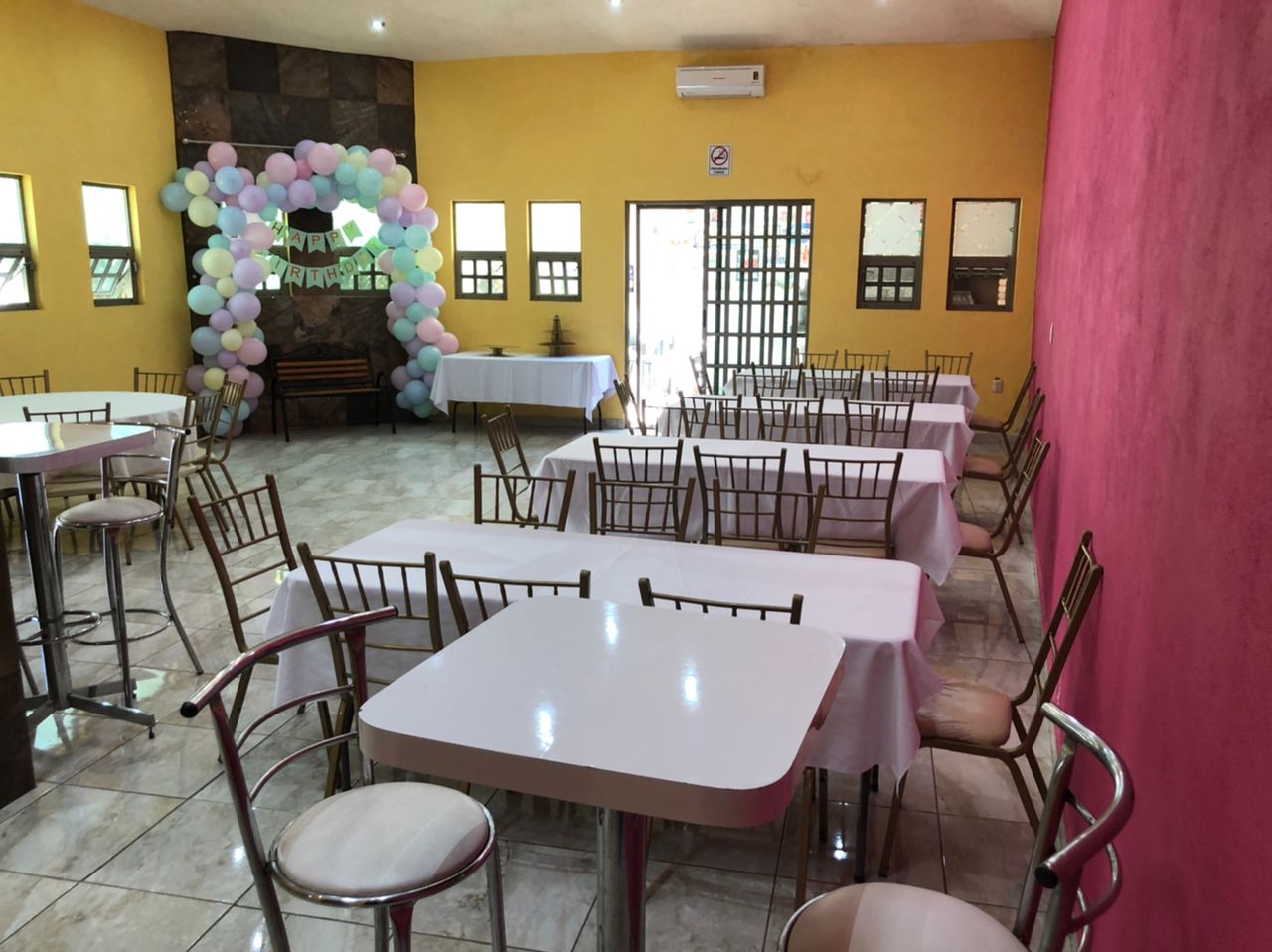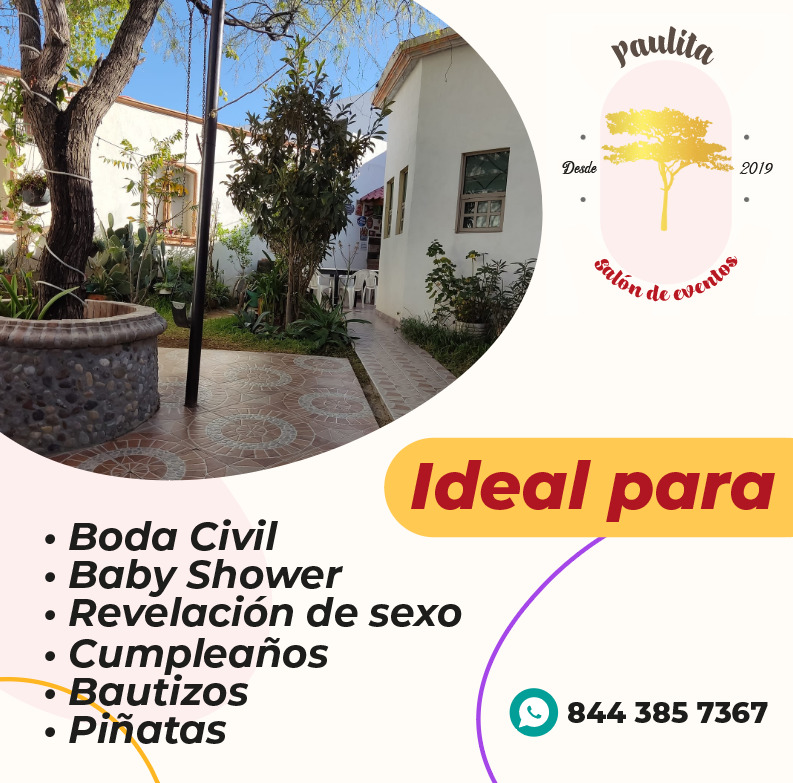 Salón de eventos, tenemos excelentes instalaciones para que disfrutes de cualquier evento social, contamos con todo el mobiliario para tu evento social, estacionamiento (calle cerrada), WIFI, diferentes áreas (cerradas y al área libre), 3 sanitarios, minisplit, asador, área verde, la renta incluye mobiliario para 50 personas más información al cel 8443857367